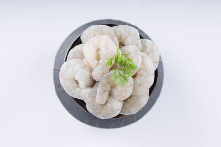 Raw peeled prawns or shrimp arranged in a black ceramic small pot and garnished with coriander leaf which is ready to cook ,placed on a white textured background.