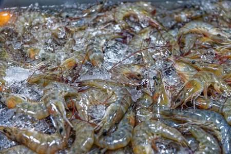 Prawns on ice, shrimp many fresh raw whole chilled, at the fish market.