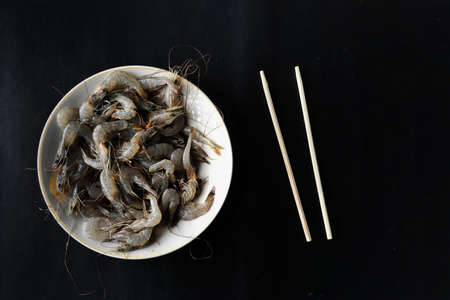 a bunch of raw prawns on a white plate and a pair of wooden chopsticks on a black background