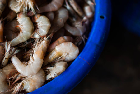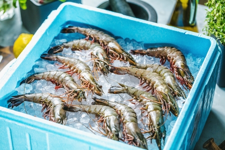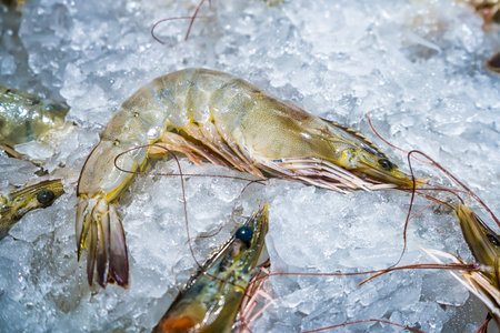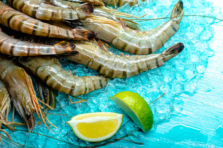 Fresh shrimp on ice ready for preparation and cooking in a vibrant setting
