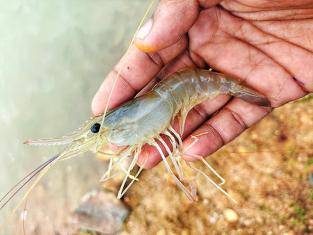 freshly harvested big freshwater prawn in hand in nice blur background