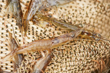 Close up view on the raw prawns in fishing net.