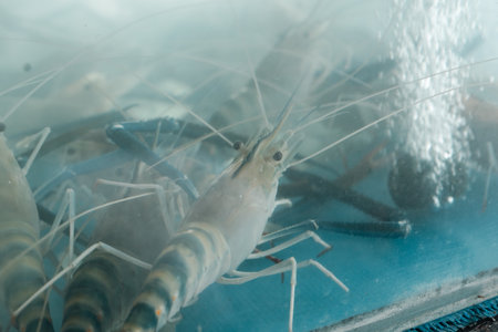Freshwater giant river prawns in a clear oxygenated tank, showcasing their blue claws and segmented shells, waiting for selection in a seafood restaurant or market with a focus on freshness and quality