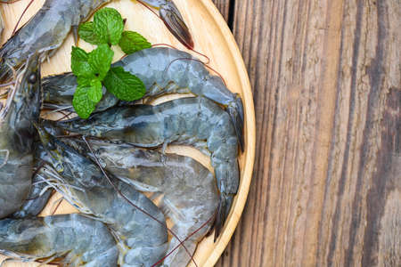 raw shrimp on wooden plate with mint leaf and wooden board background for cooking, close up fresh shrimps or prawns, seafood shelfish