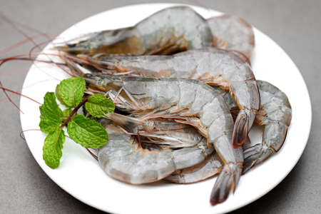 raw shrimp on white plate with mint leaf and shrimps background for cooking, close up fresh shrimps or prawns, seafood shelfish