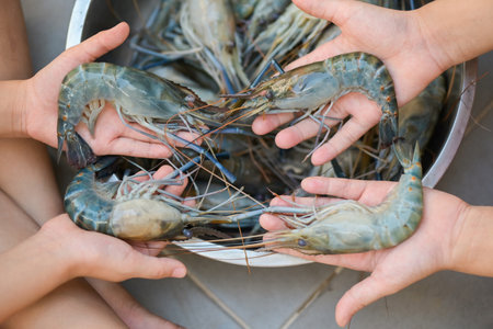 raw shrimps on hand child washing shrimp on bowl, fresh shrimp prawns for cooking seafood food in the kitchen or buy shrimps on shop at the seafood market