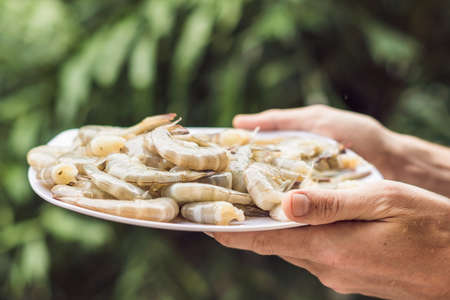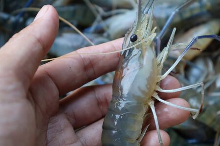 Hand holding white shrimp On a blurred background of white shrimp in a bucket