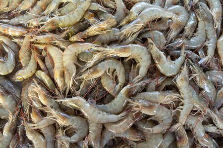 Pile of raw shrimps in fish market.