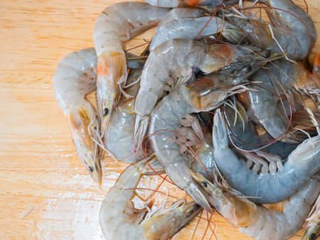 Top view of closeup fresh shrimps on cutting wooden board background in the kitchen. Cooking preparation concept.