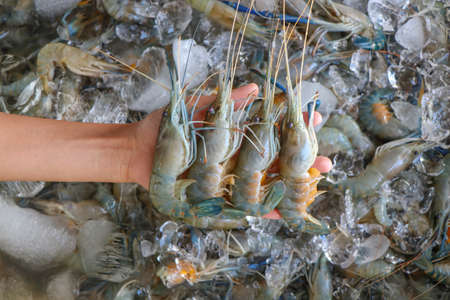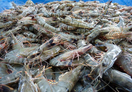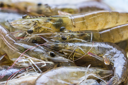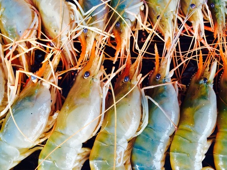 Feresh tiger prawn shrimp sell in fishery market close up seafood