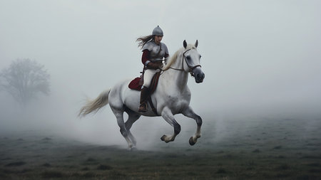 Medieval knight on horseback in a foggy field. 3d rendering