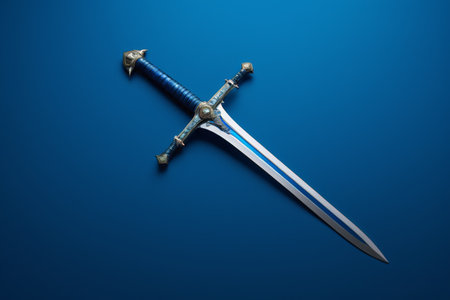 Ornate medieval sword on a dark blue background.
