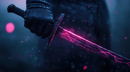 A close-up captures a sword against a backdrop of swirling mist and shadowed darkness. The metal weapon, prominently displayed, reveals detailed craftsmanship. The scene showcases a combination of cool colors and dynamic lighting effects, lending an air of mystery and anticipation. Ideal for illustrating fantasy or historical concepts in commercial projects.