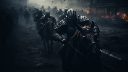 Medieval battle scene with cavalry and infantry on dark-toned foggy background. Selective focus