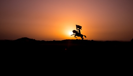 Attacking scene. War concept. Riders on horse ready to fight and soldiers on a dark foggy toned sunset background. Battle scene battlefield of fighting soldiers. Selective focus