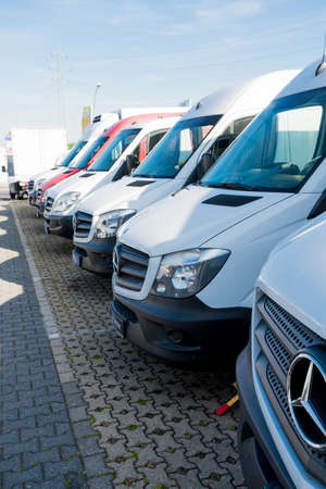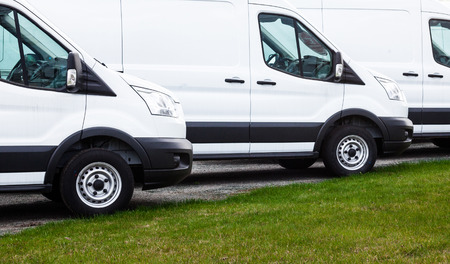 Row of white commercial delivery vans with copy space, transporting service company concept