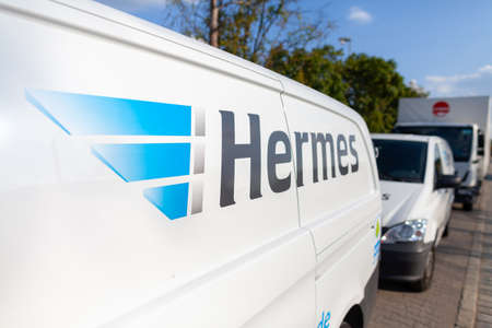 Nuernberg, Germany - August 4, 2019: Hermes branch on a Mercedes Benz delivery truck.