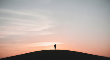 A silhouette of a solitary person standing on the crest of a hill against a soft, pastel-colored sunset sky. The minimalist composition evokes a sense of solitude, contemplation, and connection with nature.