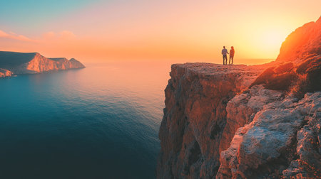Top-down view of philosopher at cliff's edge serene ocean and tranquil sunset