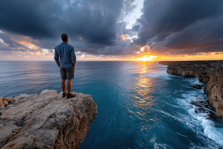 attractive man standing watching the sunset from a cliff by the sea, concept of leisure and relax, copy space for text