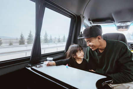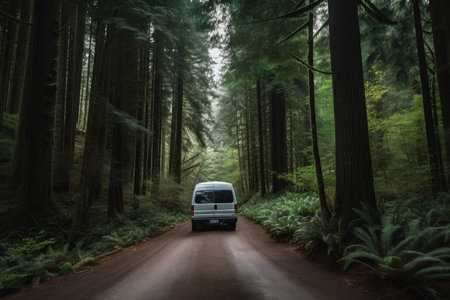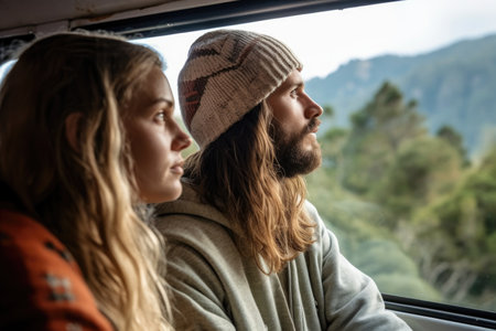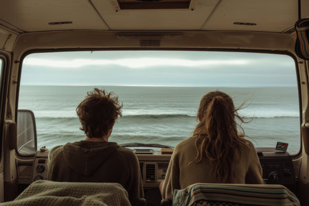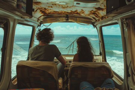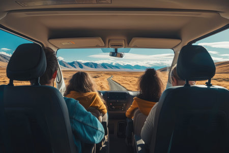 A photo of two individuals comfortably seated in the rear section of a van, A family road tripping in a spacious electric minivan panoramic scenery, AI Generated
