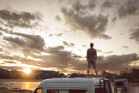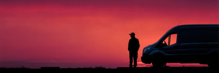 A service worker stands silhouetted next to a van as the sun sets, casting vibrant colors across the sky, creating a peaceful evening atmosphere.