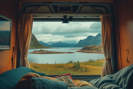 Inside view from a camper van facing a stunning lake and mountain landscape