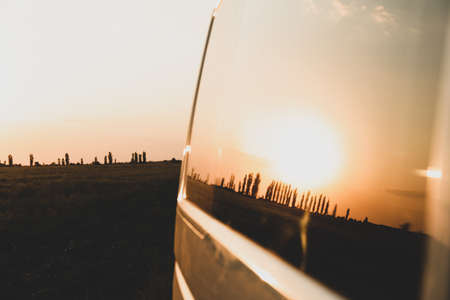 Enjoying the landscape view on a peak of the mountain from inside the all terrain vehicle, watching the sun go down at sunset. shot from outside through the front window screen