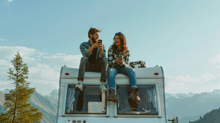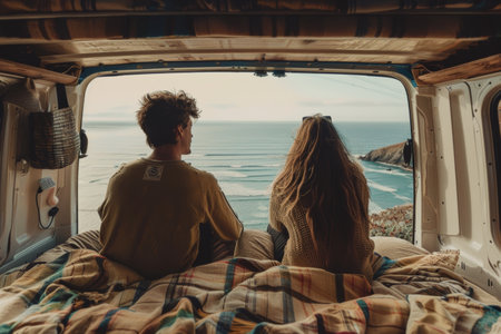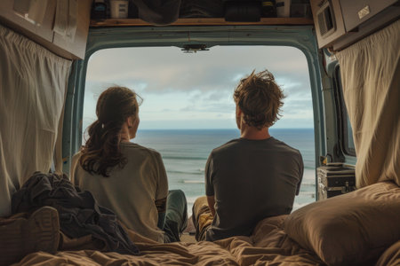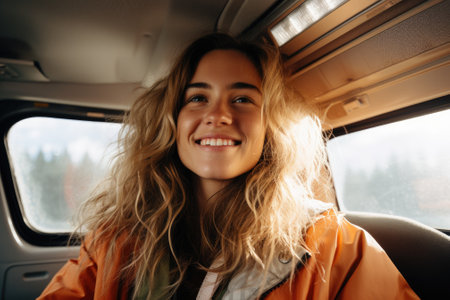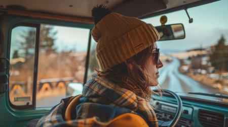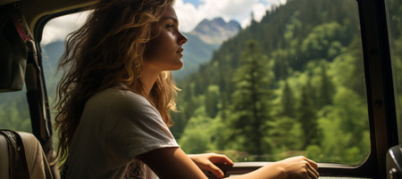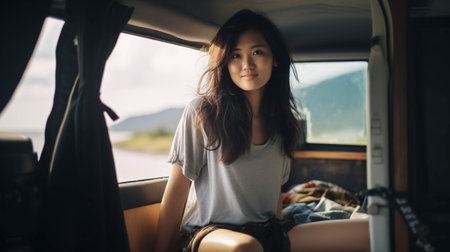 The young woman was sitting in a camper van, looking out at the mountains. Creating using generative AI tools