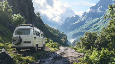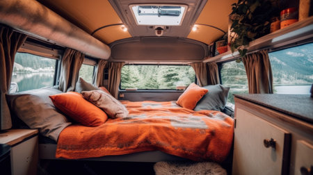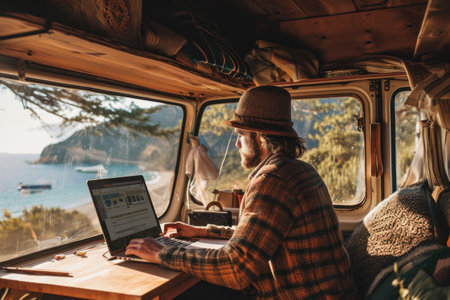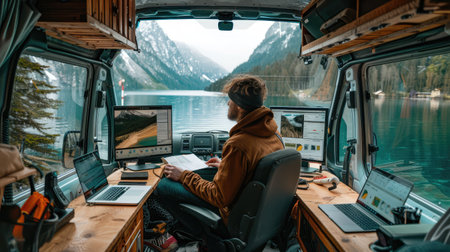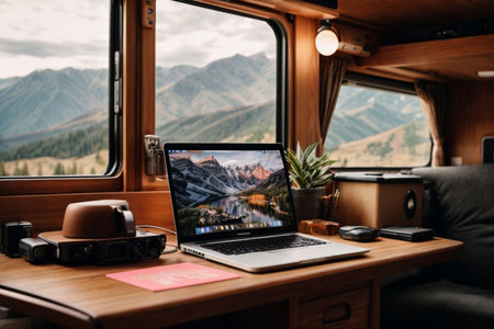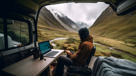 A digital nomad working on a laptop from the comfort of a cozy camper van parked in a scenic mountain landscape. Generative Ai.