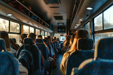 A diverse group of friends laugh and smile while inside a retro car. The warm interior is lit by the glow of the sunset. This candid moment suggests travel and shared experiences. Suitable for use in lifestyle or editorial projects promoting friendship and adventure.
