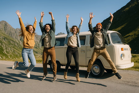Four excited young friends leap into the air simultaneously, hands raised, showcasing pure joy and freedom on a sunny mountain road. A classic camper van is parked behind them, symbolizing their adventurous road trip through a stunning natural landscape with clear blue skies and lush green mountains. This vibrant image perfectly captures the essence of friendship, travel, and unforgettable summer adventures.