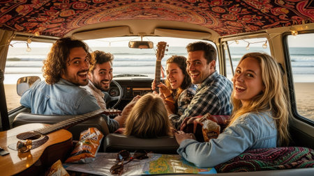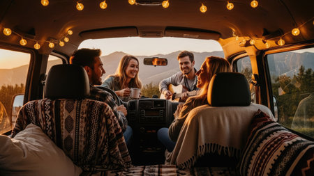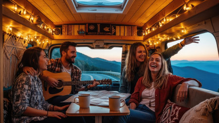 Inside a camper van, a group of friends share laughter and music. Warm interior lighting complements the vibrant sky visible through the windows. The composition captures a moment of camaraderie during a leisure activity, suggesting possibilities for travel or lifestyle imagery.
