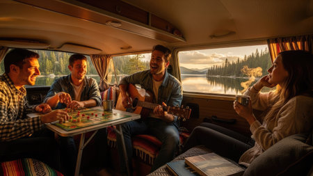A group of friends enjoys leisure time inside a van, playing a board game and a guitar. The warm interior contrasts with the outdoor landscape visible through the windows, bathed in golden sunlight. The scene suggests relaxation and shared experiences, suitable for use in travel and lifestyle projects.