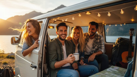 A group of friends enjoys a bright day inside a camper van parked near a serene lake. The image captures smiling individuals in casual attire, bathed in warm sunlight. The composition highlights the interior of the vehicle, suggesting a journey or recreational activity. This scene is suitable for various commercial uses, illustrating leisure and travel concepts.
