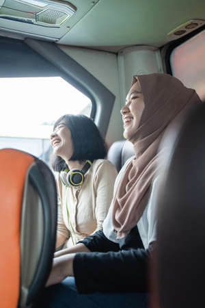 Cheerful Asian mother and daughter sitting in car and touching mobile phone, Going on a trip and different generations senior elderly and teenager concept
