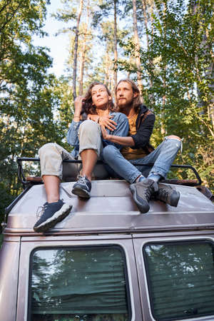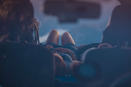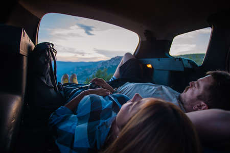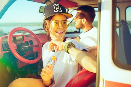 Laughing romantic couple sitting in car while out on a road trip at summer day