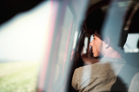 A young man sitting in a car on roadtrip through countryside, shot through glass.