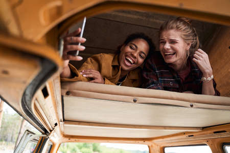 Love and relationship concept with couple of traveler with old vintage van kissing and taking a selfie picture -alternative lifestyle and. vacation with beautiful woman and man outdor