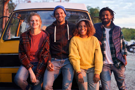 Multiracial young friends travelling together by car, looking at camera and smiling - summer vacation, holidays, travel, road trip and people concept.
