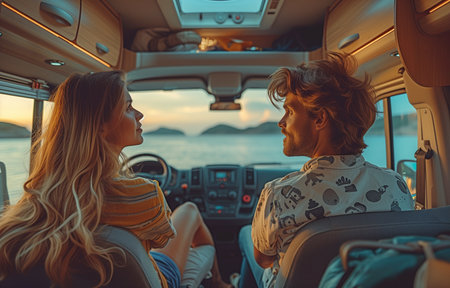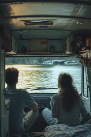A man and a woman are sitting inside a motorhome and looking at the lake. Camping by the lake in a mobile home.