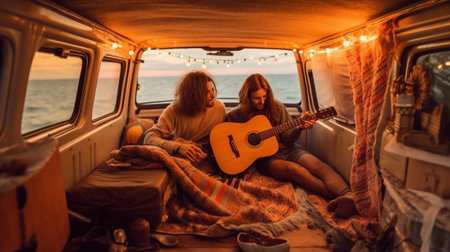 Do you like my new song Handsome young man playing guitar for his beautiful girlfriend while sitting in retro style mini van : Generative AI