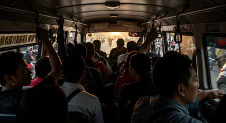 The interior view from the back of a crowded public minibus or 'angkot' in Indonesia. Passengers are seen from behind, some holding onto handles, while the driver is visible in the front right. The setting sun glows through the front windshield, illuminating a busy street with motorcycles.