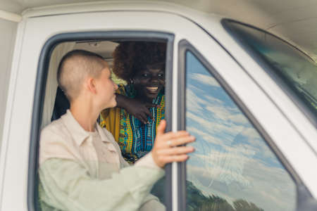 Ethnic dark-skinned straight couple having a summer road trip in a camping van, driving, talking and laughing heartily inside their vehicle. High quality photo