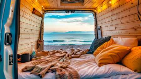 A van is parked on the beach with a bed inside. The bed is covered in blankets and pillows, and there is a cup and a bottle on the bed. The scene is peaceful and relaxing
