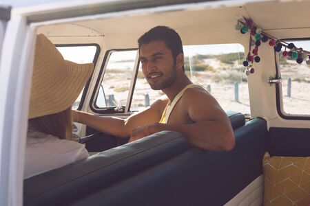 Side view of young diverse couple interacting with each other in a camper van at beach