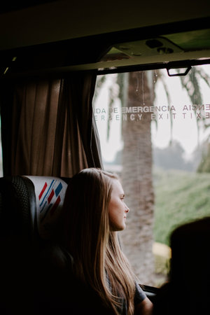 Teenager wearing hijab and glasses sitting on the bus looking out through the window. Travelling concept.