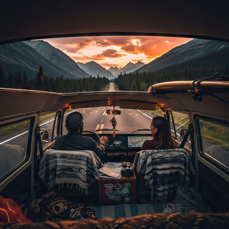 Two individuals are seen inside a classic vehicle, driving along a road flanked by mountains. The image showcases an orange and yellow sunset. The scene highlights the open road and the joy of traveling. This image is suitable for various commercial uses, including travel-related campaigns and lifestyle content.