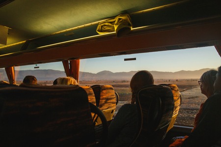 Enjoying the view on a peak of the mountain from inside the all terrain vehicle at sunset.