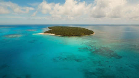 Aerial view of beautiful tropical island Daco with white sand beach. View of a nice tropical beach from the air. Beautiful sky, sea, resort. Seascape: Ocean and beautiful beach paradise. Philippines. Travel concept.